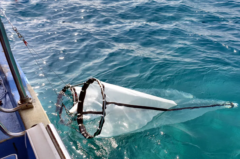 Our zooplankton nets are fitted with flow meters to record the volume of water sampled per trawl and to facilitate quantitative assessment.